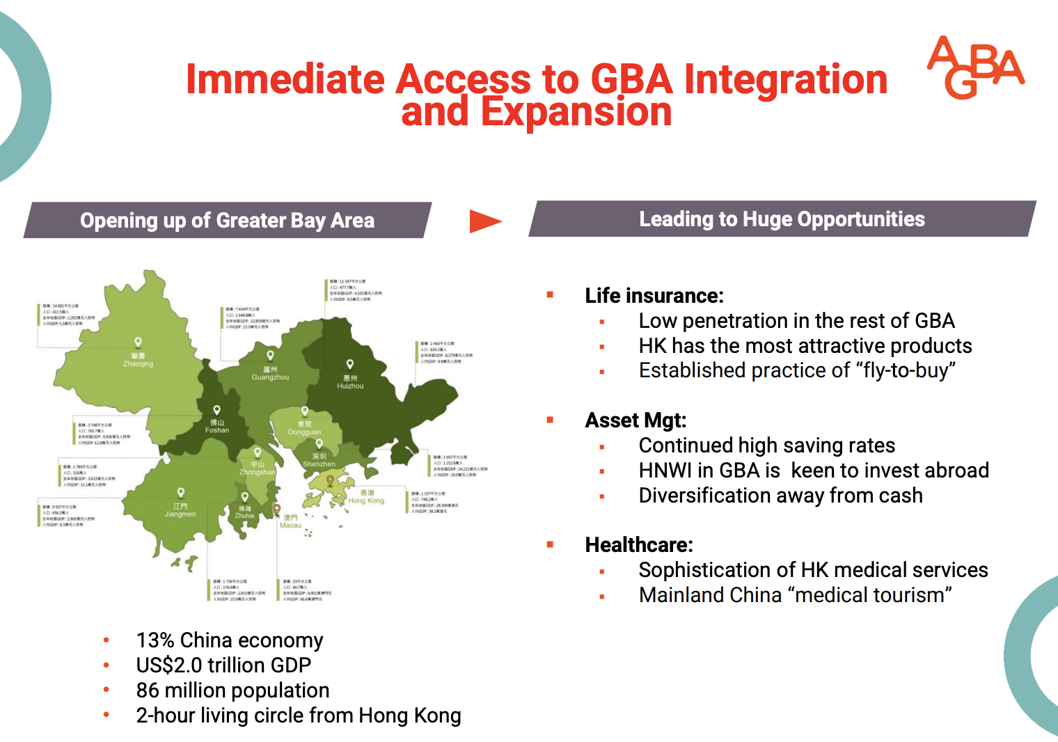 ✔ AGBA grants immediate access to GBA integration and expansion, with the Greater Bay Area encompassing 13% of China's economy, a US$2.0 trillion GDP, an 86 million population, all within a 2-hour living circle from Hong Kong.