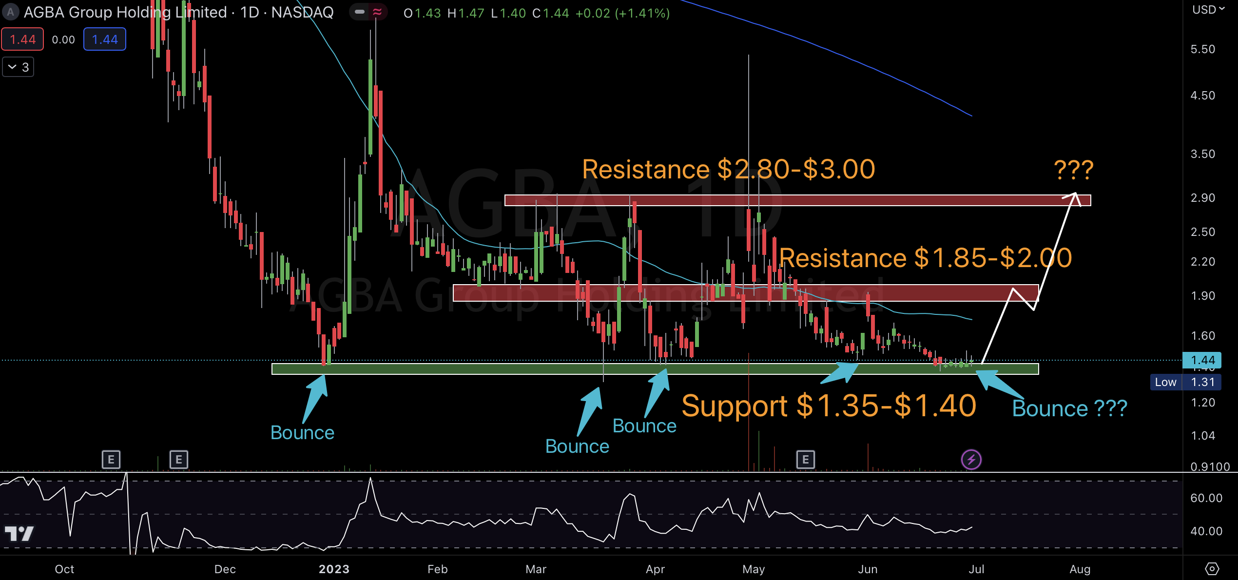 AGBA's stock price is starting to curl up amid a decent increase in the total traded shares which affirms people are expecting a short term bounce. With the stock trading for about $1.40 a share, while sitting at a big historical support zone, there is no doubt it could explode from here to over $2.00 as it remains highly undervalued at its current valuation.